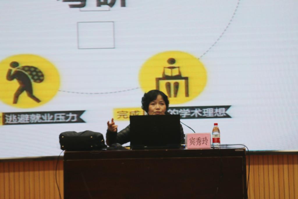 第二讲由宾秀玲老师主讲。宾秀玲老师以分析就业、考研、留学三者开讲,三者收入、就业优势、评聘职称、出国学习或晋升机会皆不同。接着,宾秀玲老师以亲身经历为例,从考研的各个步骤展开详细的讲解,包括备考、报名、考试、注意事项以及各种突发情况的相应解决办法等,并向同学们介绍2138CC太阳集团考研政策,严谨中不失幽默风趣,成功化解同学们紧张沉闷的备战考研氛围,让同学们轻松将重点铭记于心。