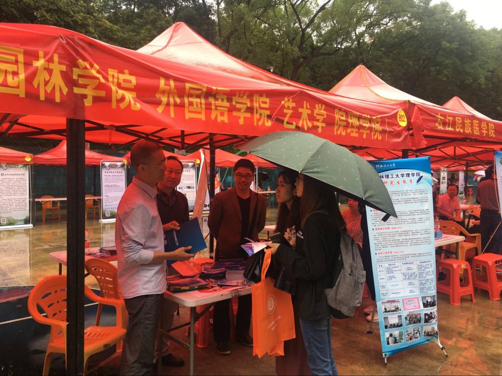 10月10日上午,研究生院组织旅游与风景园林学院、外国语学院、艺术学院和理学院等学院老师,参加由中国教育在线主办的2019级研究生招生现场咨询会(南宁场)活动,就考生关心的问题接受现场咨询,活动地点在广西民族大学东校区,来自南宁及周边高校的考生来到现场咨询研究生招生事宜。