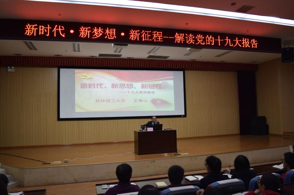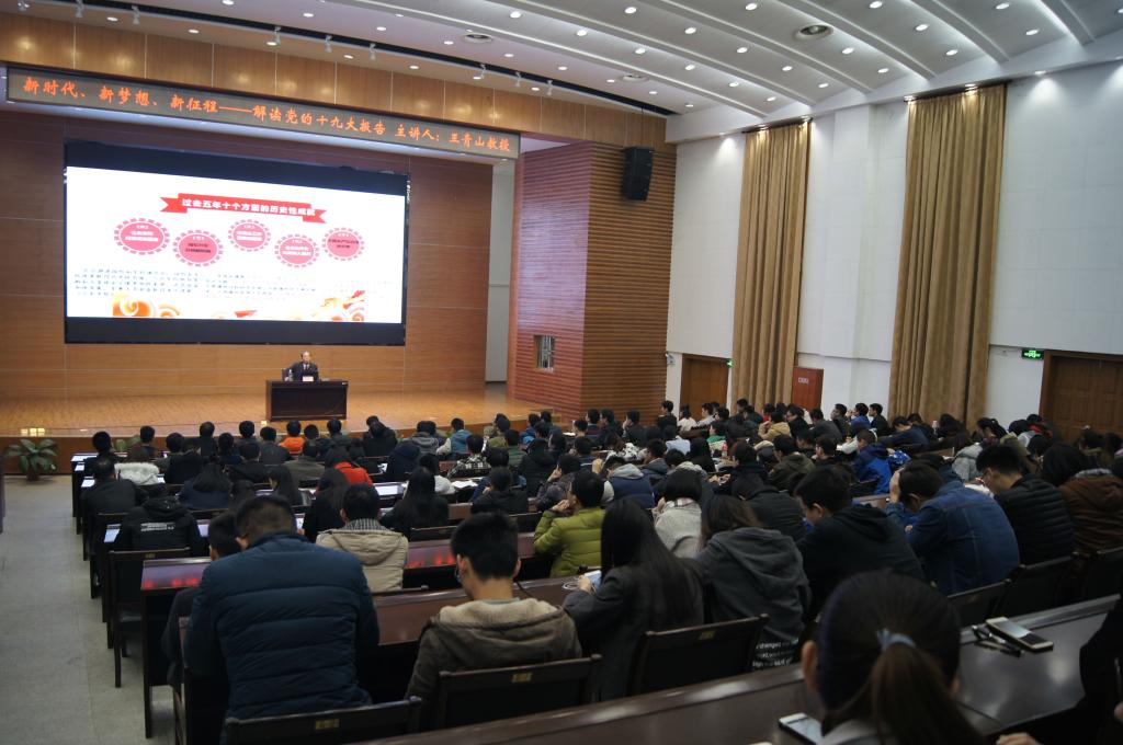 报告会邀请了马克思主义学院党委书记王青山教授以《新时代·新征程·新梦想——解读党的十九大报告》为题进行了专题辅导。王教授紧紧围绕党的十九大2138CC太阳集团新时代、新思想、新目标、新征程的重大判断和第二个百年奋斗目标“两步走”的战略部署,系统解析了党的十九大精神。他从国家的国情、所取得的巨大成就、社会主要矛盾变化等三个方面,说明我们国家进入了新时代。接着,王书记阐述了习近平新时代中国特色社会主义思想的深刻内涵,介绍了新时代下坚持和发展中国特色社会主义的基本方略。他认为,习近平新时代中国特色社会主义思想开辟了马克思主义新境界,开辟了中国特色社会主义新境界,开辟了中国共产党治国理政新境界,开辟了管党治党新境界。最后,王书记剖析了新时代中国特色社会主义的总布局,并号召广大研究生响应时代召唤,放飞青春梦想,以昂扬姿态,步入新的征程。
