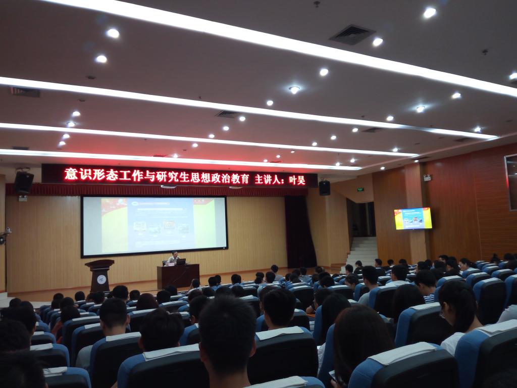2017年9月25日晚,研究生院在雁山校区图书馆报告厅举办意识形态工作专题报告会,报告会由学校党委委员、宣传部部部长叶昊同志主讲,由研工部副部长、研究生院副院长金峰同志主持,来自15个研究生培养学院的260余名研究生党员代表聆听了报告。