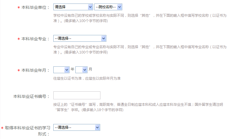 (2)如没有本科学历,则在相应的选项中不做任何修改,即“本科毕业单位”、“本科毕业专业”选择“请选择”,“本科毕业时间”选择“ ”(即空白),“取得本科毕业证书的学习形式”选择“请选择”,见下图示例。