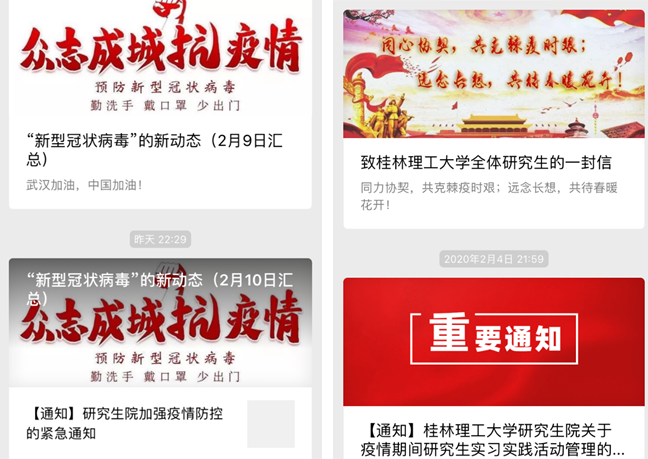 针对研究生学生群体特点,通过研究生院公众号、研究生会公众号、研究生院网站、各学院微信公众号、班级微信群、班级QQ群等媒体平台向全体研究生及时通报疫情实况、发送通知要求、科普卫生知识,宣传防控要求,研究生院累计推送相关推文近30篇,其中“2138CC太阳集团研究生会公众号”坚持每天转发“新型冠状病毒”新动态,引导研究生明确疫情现状、不轻视、不恐慌、不信谣、不传谣,静沉着理性应对疫情。