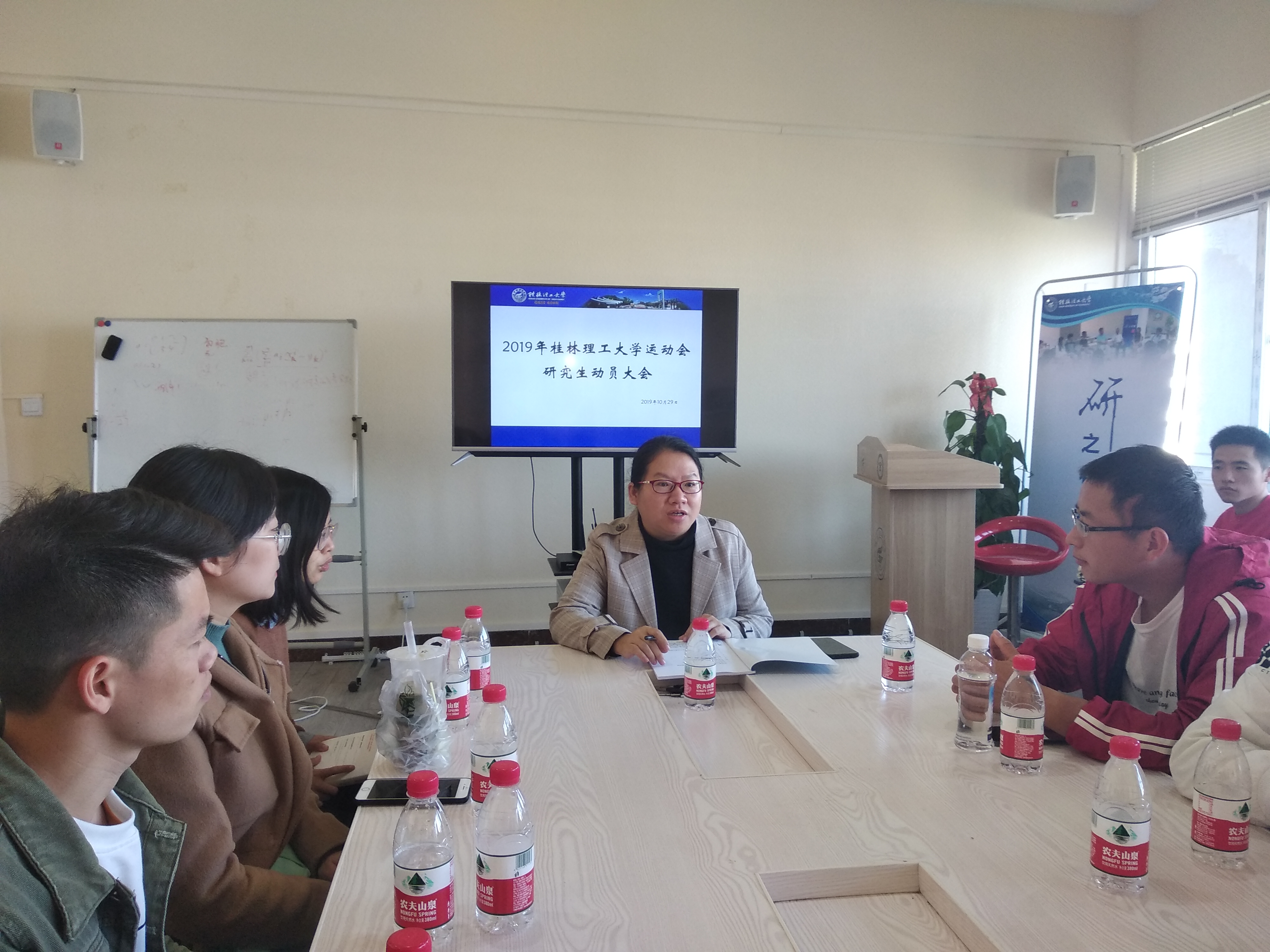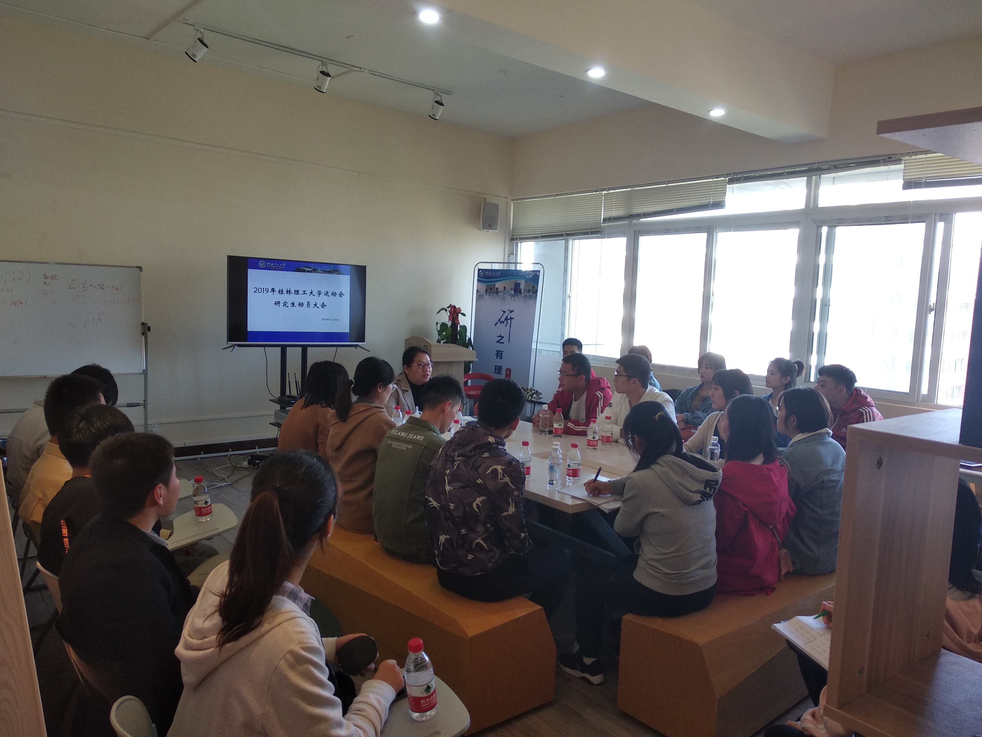 为了更好地迎接校运会的举行,10月29日中午研工部在雁山行知楼研究生创新创业中心举行运动会前的动员大会,近40名运动员参加了动员会,研工部副部长、研究生院副院长江玲老师为全体运动员做动员。