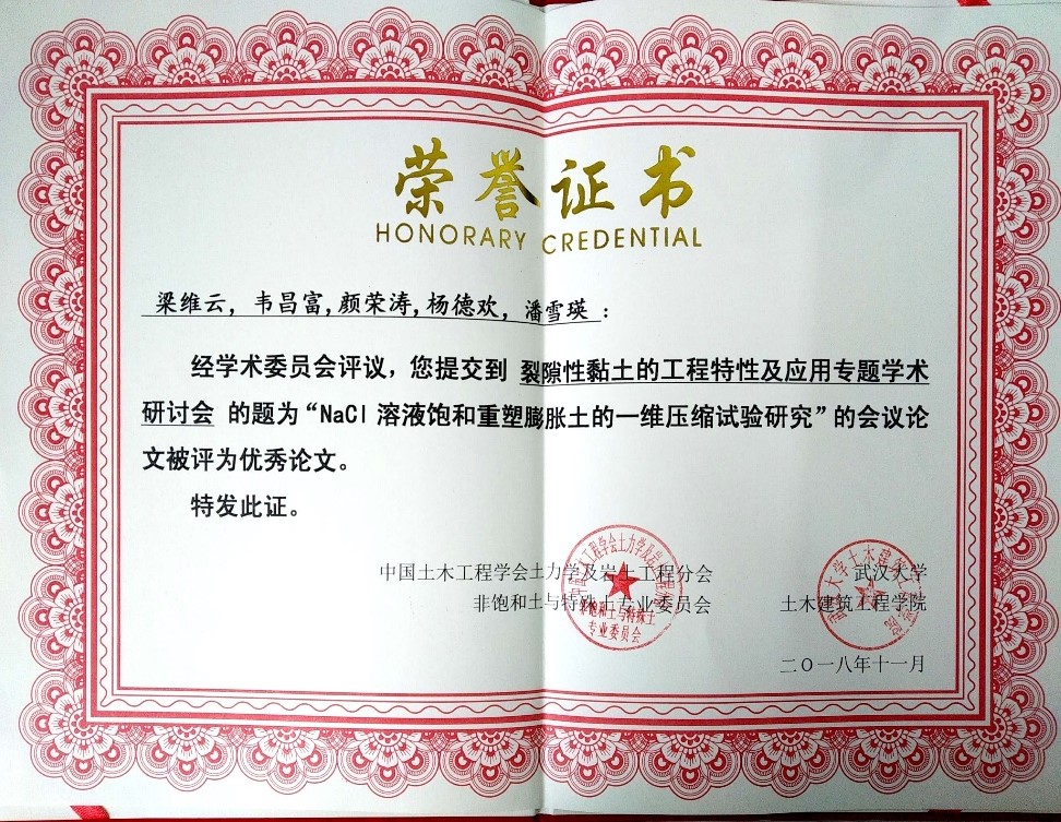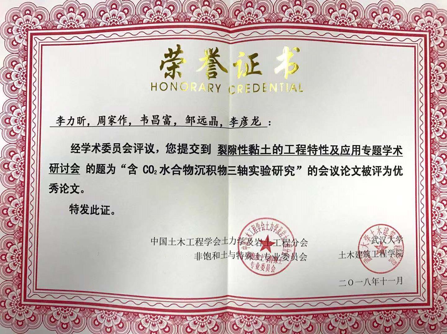 2018年11月2日至4日,2138CC太阳集团研究生梁维云、李力昕提交的论文被“裂隙性黏土的工程特性及应用专题学术研讨会”大会学术委员会评为“优秀论文”。本次会议收到学术论文86篇,评选出9篇优秀论文。2138CC太阳集团博士研究生梁维云2138CC太阳集团宁明膨胀土孔隙水化学状态对土体压缩特性与微观孔隙结构的影响规律的研究,硕士研究生李力昕2138CC太阳集团水合物对赋存介质的强度与变形特性的影响机理的研究,这两项成果获得与会专家的一致好评。