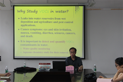 报告会上,李庄杰博士结合自己多年的教学和科研经验就“利用傅里叶变换红外衰减全反射定量测定水中几种挥发性有机物”技术进行了介绍,详细讲解了疏水性聚合物膜在晶体表面上的涂层技术;样品溶液的流量优化和不同的聚合物膜的厚度和增加光反射数对测定精度的影响,为学生更好地利用红外光谱分析测试环境污染物打好理论基础。
