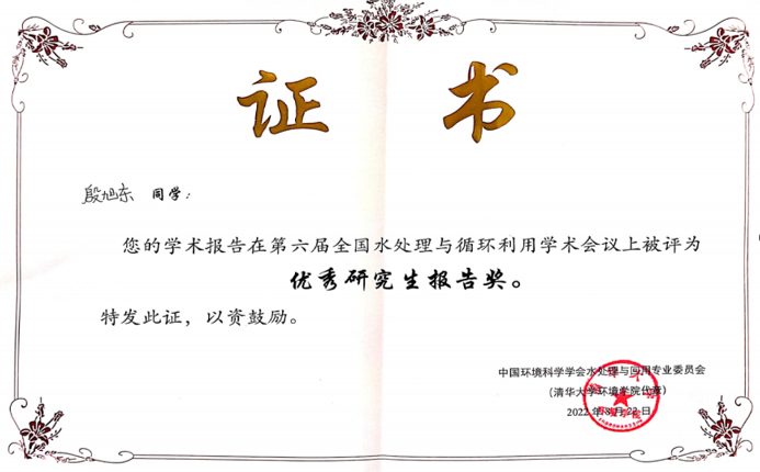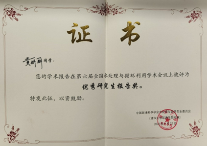 会议共设置了二十四个分会场,100余位来自全国知名高校、科研院所及行业代表性企业的专家学者,围绕水处理与循环利用领域的前沿科学问题、关键技术、工程实践和政策管理等内容做了精彩的报告。会场学术气氛浓厚,一批水处理与循环利用领域的高水平研究成果在会上得到了充分的交流。会议设置了优秀研究生专场,环境科学与工程学院博士研究生殷旭东和黄丽丽分别以“磷掺杂 g-C3N4/Bi2WO6 异质结的制备及其可见光催化性能研究”和“硅藻基Cd(II)表面离子印迹聚合物的制备、表征及吸附特性”为主题在分会场做了汇报交流,均获得“优秀研究生报告”奖。同时,学校有50余位研究生志愿者获得会议“优秀志愿者奖”。